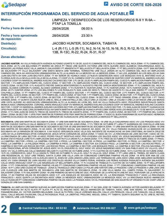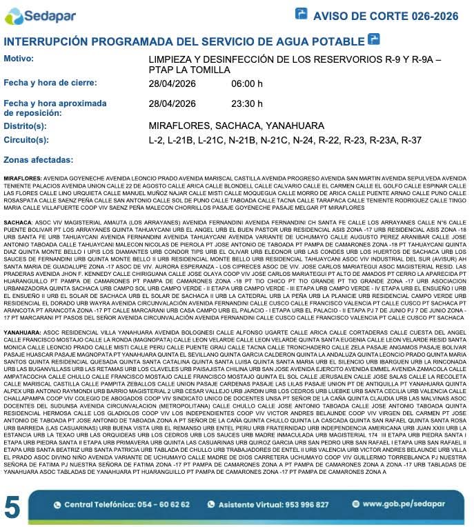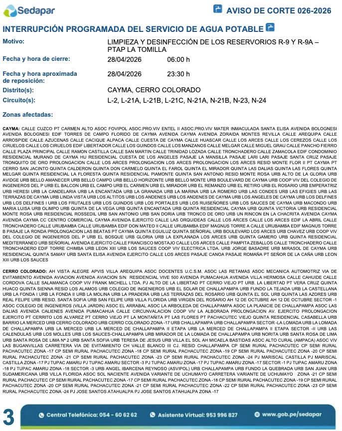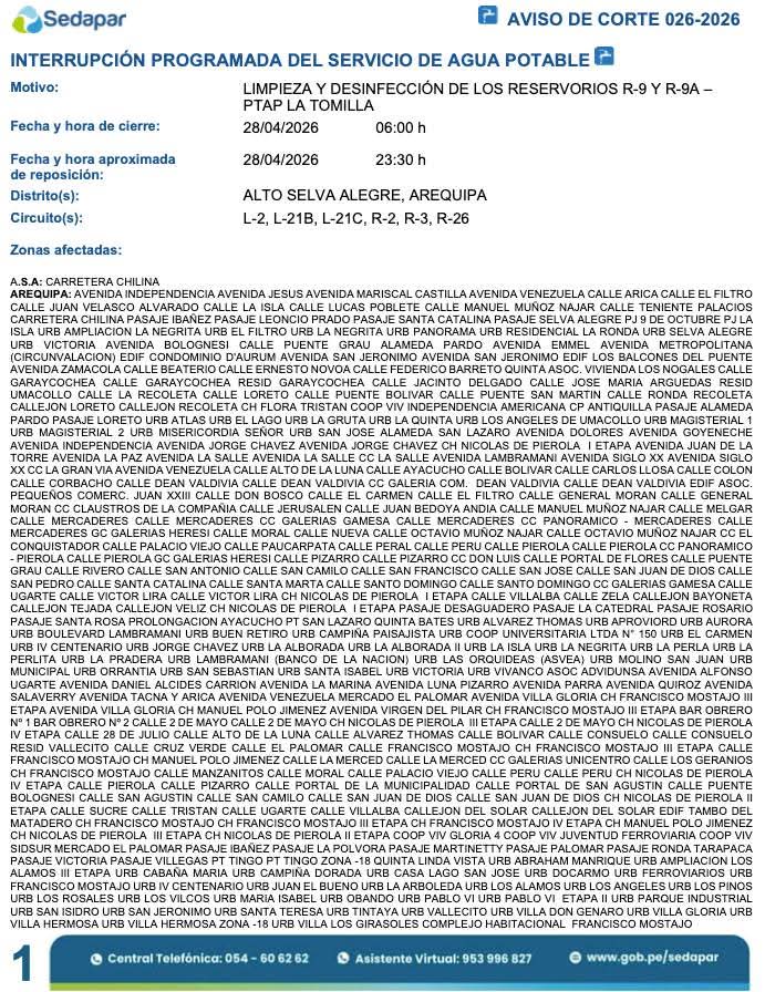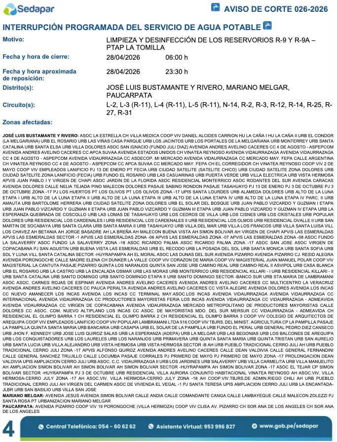 La empresa Sedapar informó que este martes 28 de abril se realizará un corte programado de agua potable en 13 distritos de Arequipa, debido a trabajos de limpieza y desinfección en los reservorios R-9 y R-9A de la Planta de Tratamiento La Tomilla.