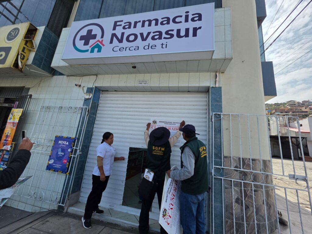 Luego de realizar un operativo para proteger la salud de la población en los sectores de Israel, Balneario de Jesús, entre otros, la Municipalidad de Paucarpata en coordinación con la Gerencia Regional de Salud – GERESA e Indecopi, clausuraron temporalmente una decena de boticas que operaban con serias irregularidades.